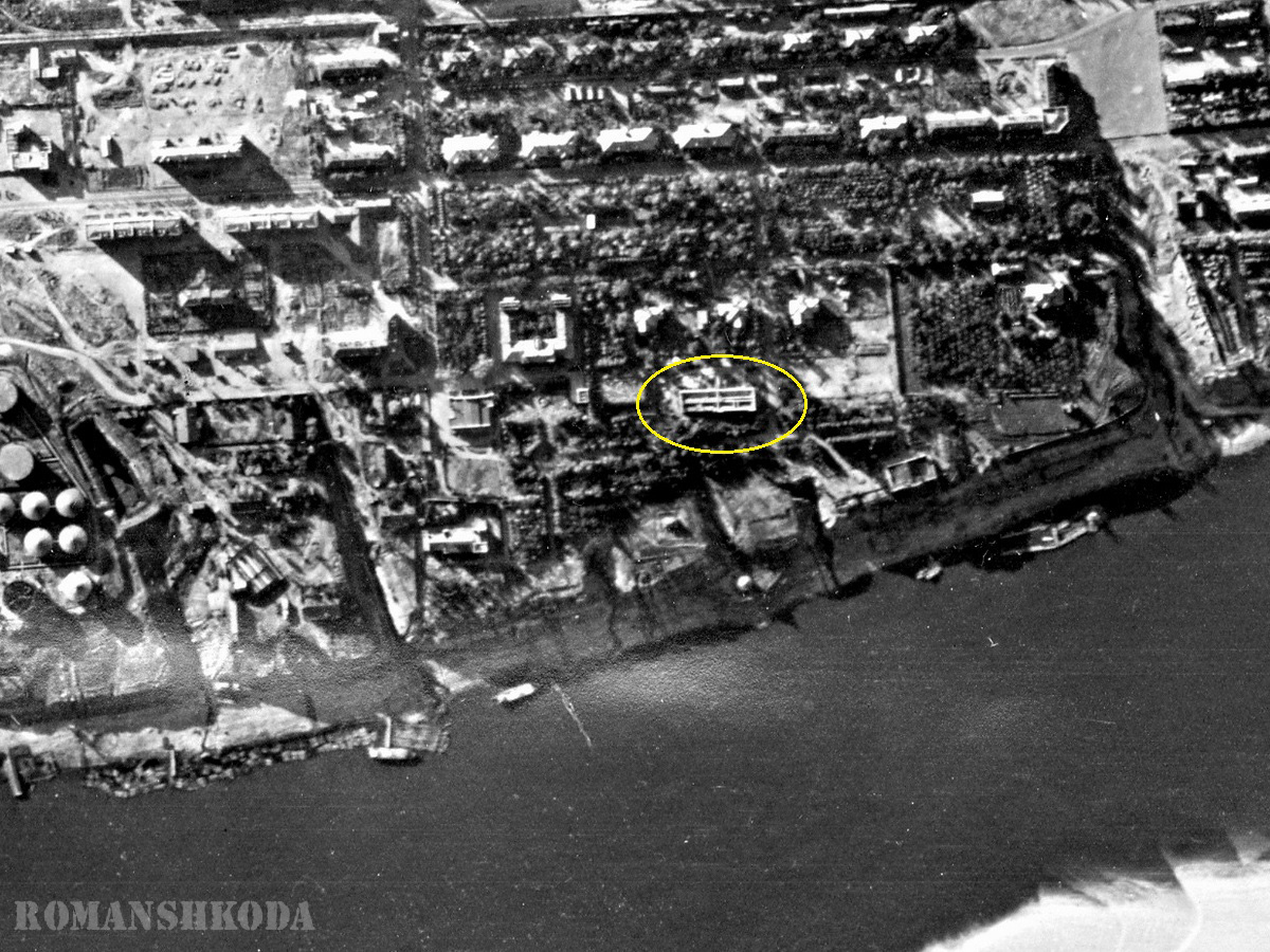 Кадр аэрофотосъёмки августа 1942 г. Все здания вокруг ещё целы, здание на месте будущего техникума (обведено овалом) стоит недостроенное