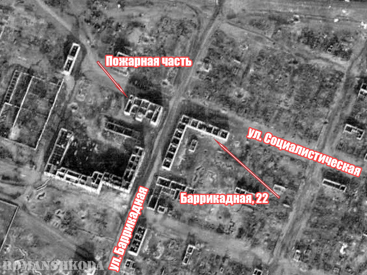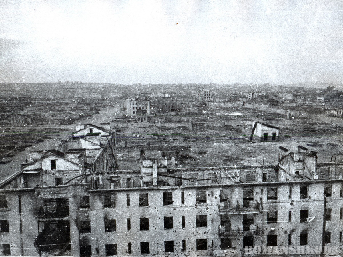Эпизод Сталинградской битвы. Группа немецких солдат, замаскировав орудие, выглядывает из-за угла дома Баррикадная, 22, смотрит в просвет ул. Баррикадной, это, скорее всего — сентябрь 1942 г. Возможно, что фото постановочное