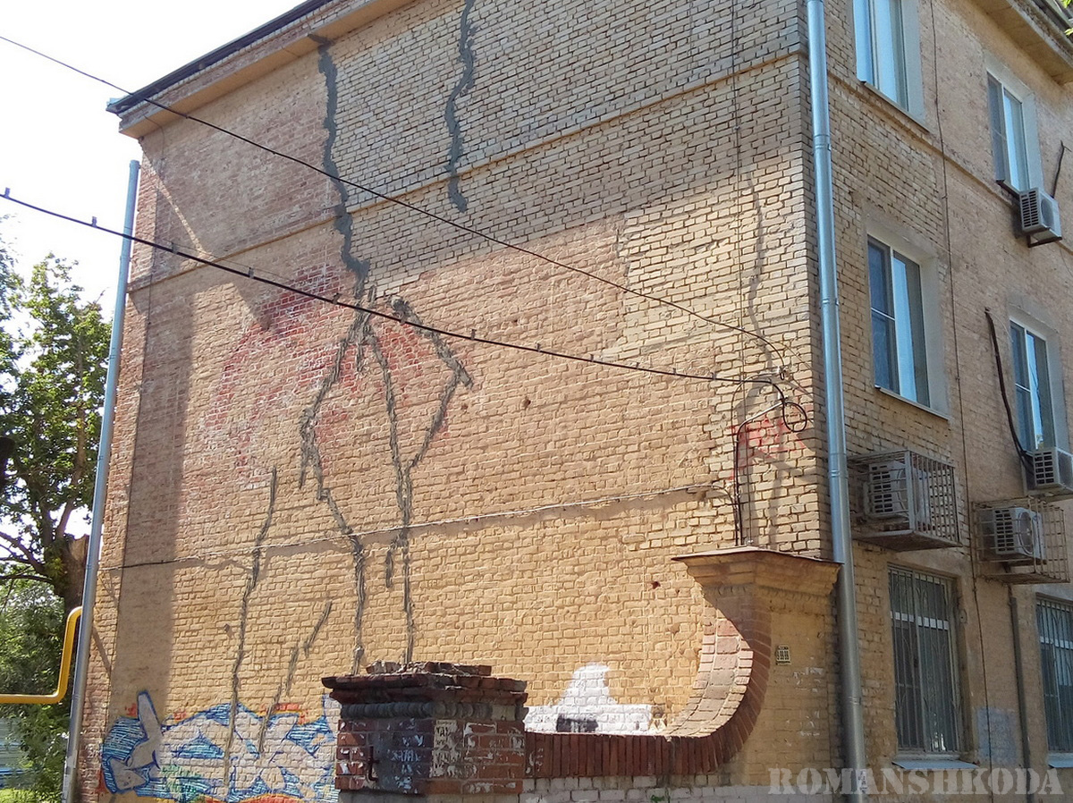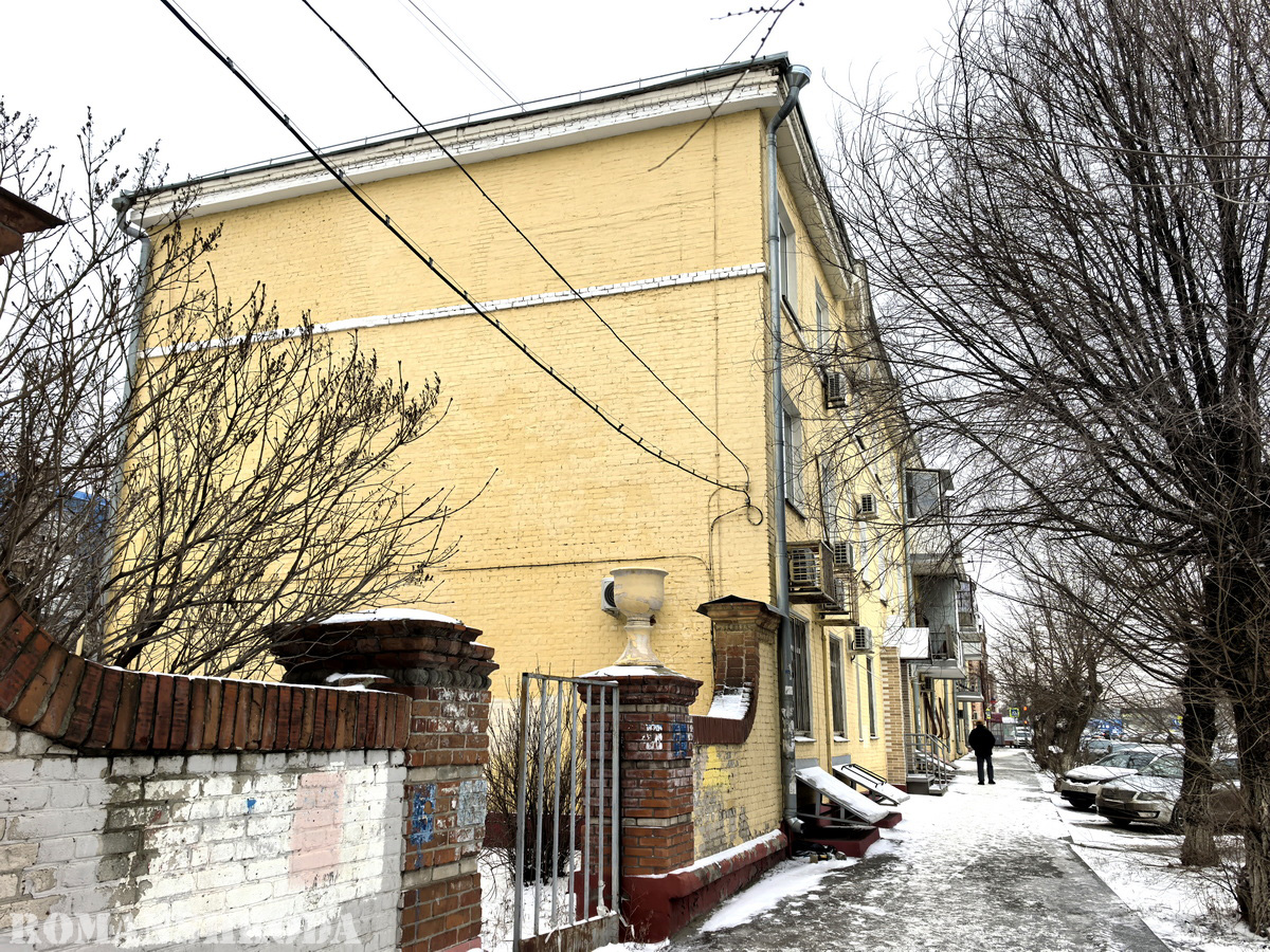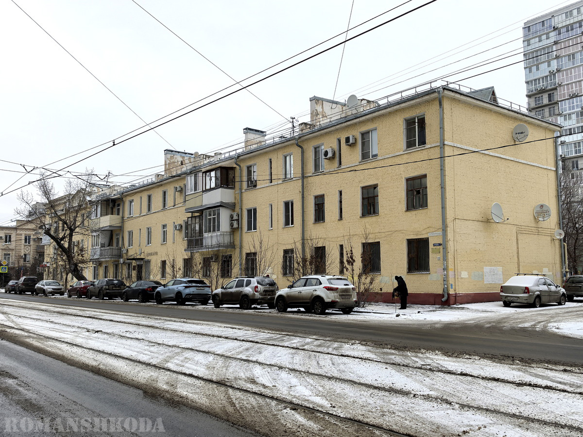 Фото до капремонта в 2018 г. показывает восстановленный торец здания, часть стены выложена из довоенного красного кирпича, а часть — из послевоенного силикатного, сейчас здесь всё закрашено (после капремонта)