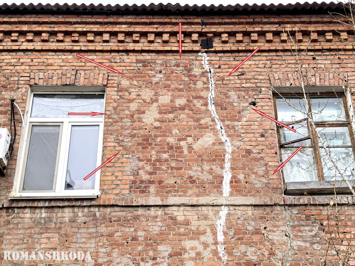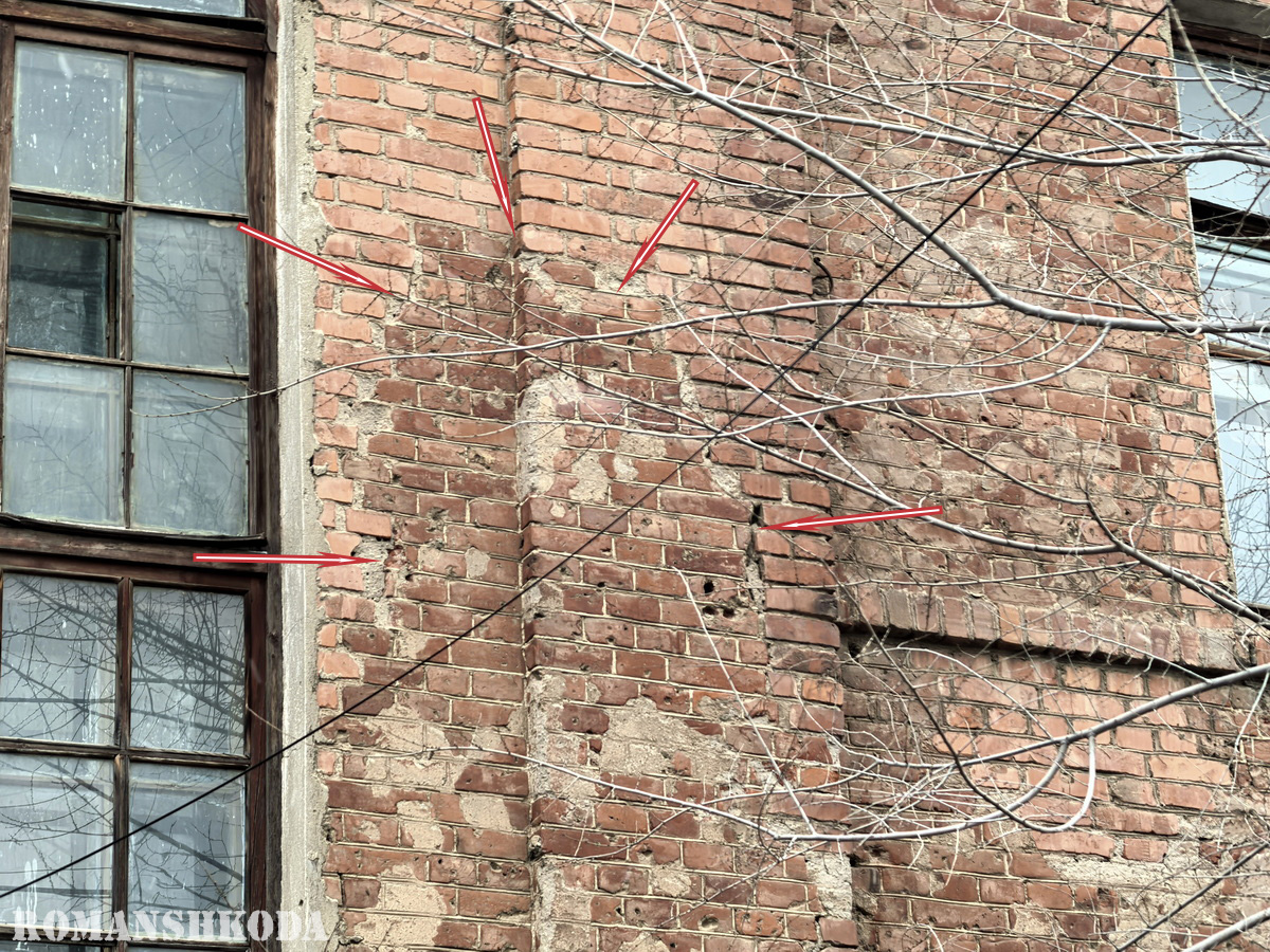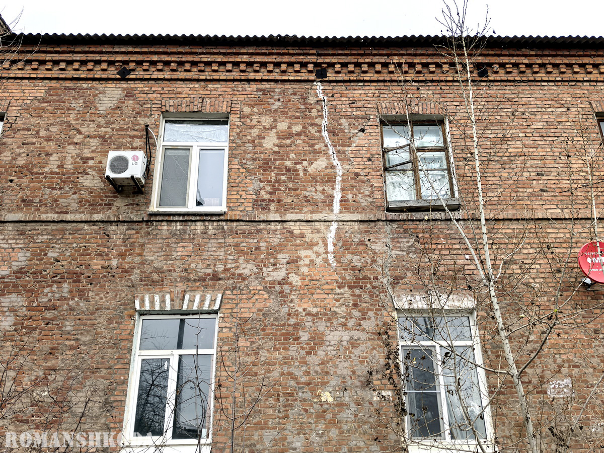Все стены избиты сквозными пробоинами от попадавших в них снарядов. Верхняя линия под карнизом везде рвано-ломаная: крышу сорвало взрывом, вызвавшим обрушение кромки, все эти разрушения были заложены ещё в конце Великой Отечественной, дом был возвращён в жилой фонд уже в 1945 г.